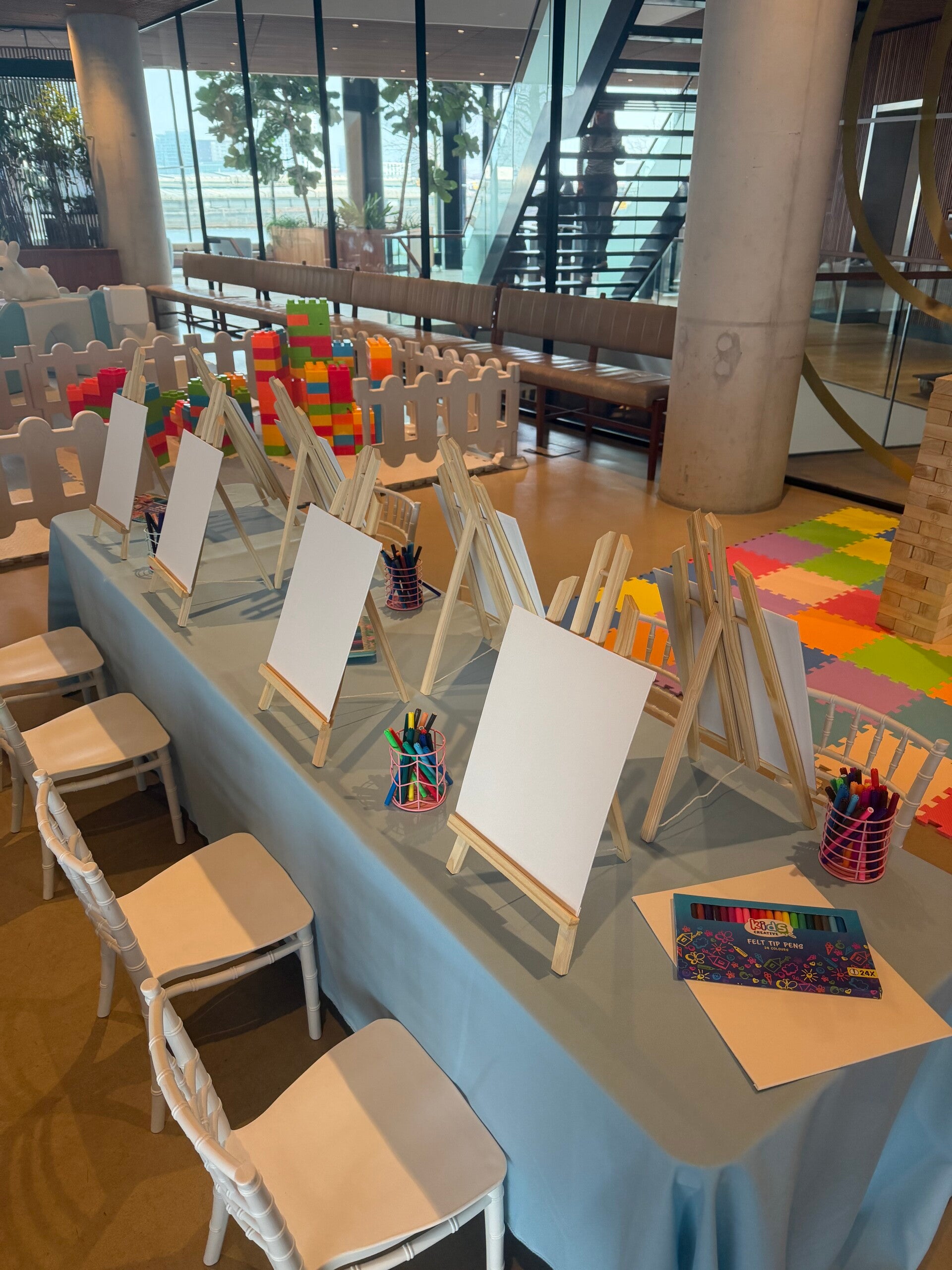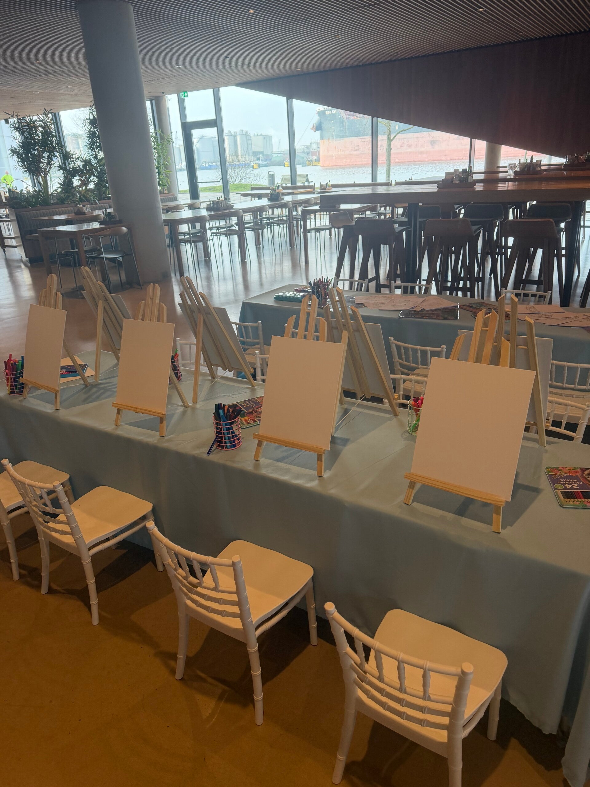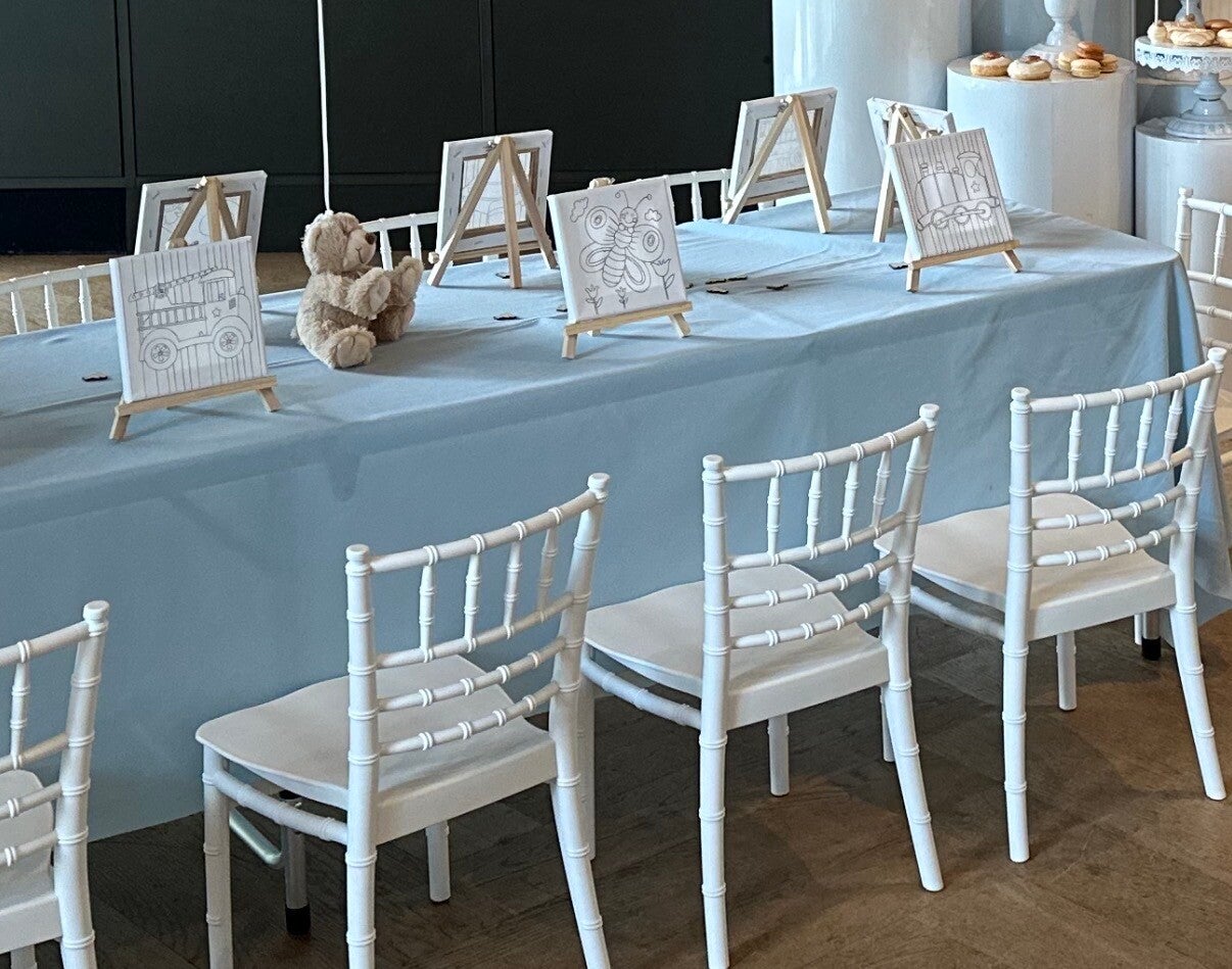 Thema-tafels voor maximaal 10 kinderen worden aangeboden voor een bedrag van €225 per set (inclusief tafel, een stof kleed bekers en bordjes en 12 stoelen).